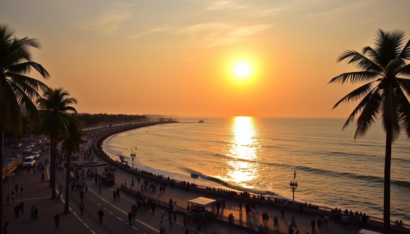 Marine Drive in Mumbai is a top spot for many activities. Watching the sunset is a favorite, with the Arabian Sea as a backdrop. The sky turns into a colorful spectacle, perfect for photos.