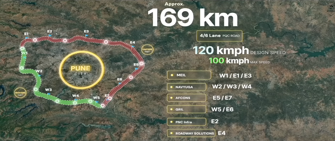 The Pune Outer Ring Road is a 4-6 lane, access-controlled highway with a 110-meter-wide right-of-way, allowing speeds up to 120 km/h. It connects taluks such as Khed, Haveli, Purandhar, Bhor, Mulshi, and Maval. The project is split into: